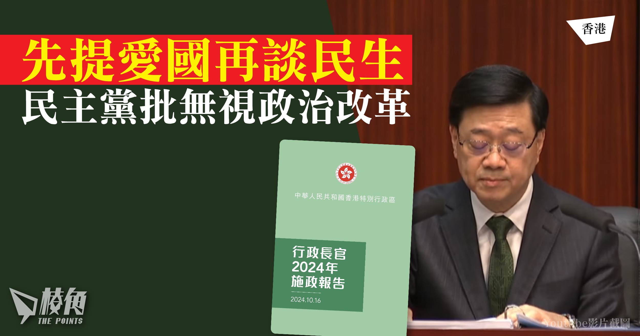 行政長官李家超周三(16日)發表任內第三份《施政報告》,他先強調落實「一國兩制」及加強愛國主義教育,再提出各項有關民生、稅項及經濟政策,惟未有篇章提及選舉制度及政治改革。李家超在其後記者會上表示,香港已有完善選舉制度,政改問題亦非今屆政府需優先處理的事項。民主黨回應施政報告,批評李家超對政改毫無想法,阻礙市民的社會參與度。