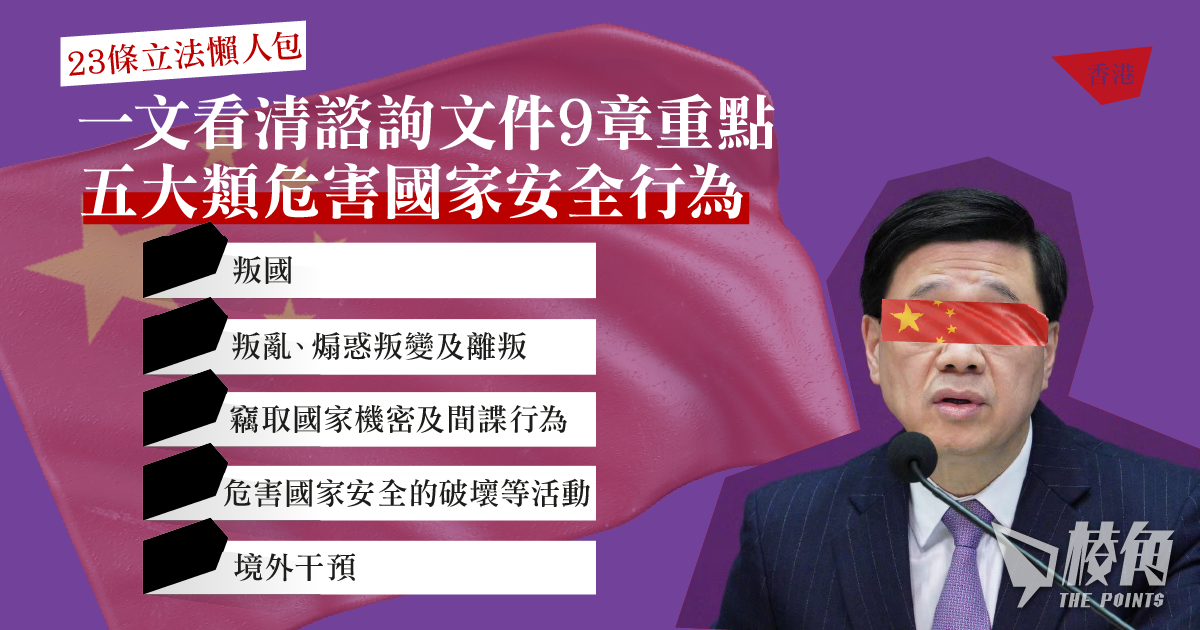 行政長官李家超今日(30日)宣布展開《基本法》23條本地立法諮詢,直至228日。公眾諮詢文件共有9章,連同附件共86頁,文件提到建議引入叛亂罪、新增境外干預罪、竊取國家機密及間諜行為等。以下是諮詢文件9章的重點。
