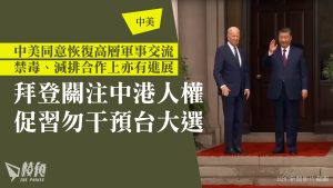 美國總統拜登與中國國家主席習近平周三(11月15日)在美國三藩市會晤。中美雙方在會談上取得一定成果,包括同意恢復去年中斷的高層軍事交流,亦在禁毒、減排等合作上取得進展。不過,政治議題上的關鍵分歧仍然存在,雙方一再重申既有立場。拜登在會上向習近平表明關注中國在包括香港、新疆、西藏等地侵犯人權的問題,亦敦促習近平切勿干預台灣大選。而習近平則呼籲美國停止軍售台灣及取消單邊制裁。