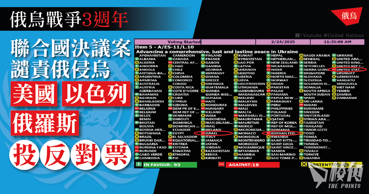 俄烏戰爭三週年,聯合國周一(24日)召開大會通過多項有關「俄烏戰爭」的議案,其中一項譴責俄羅斯侵略烏克蘭的決議案中,美國罕有地與俄羅斯同時投反對票,與歐洲主要國家持相反立場。英國廣播公司(BBC)報道指,特朗普執政後連番動作討好莫斯科,破壞了美國與大西洋聯盟的長期關係。