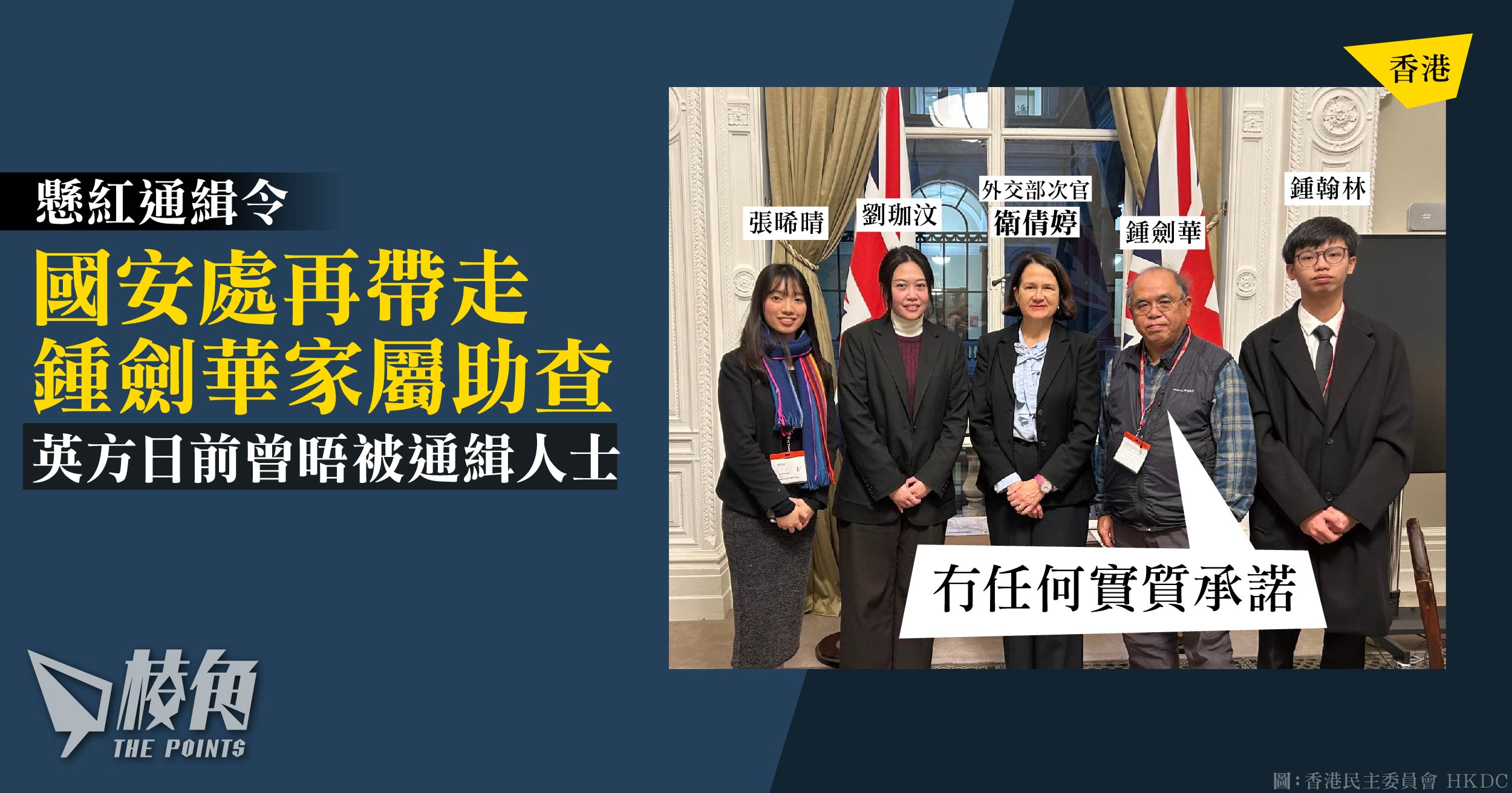 警方國安處周三(22日)帶走被通緝鍾劍華的3名弟妹到警署助查;上周三(15日),國安處亦曾要求鍾劍華在港妻兒到警署。英國外相林德偉(David Lammy)、及外交部政務次官衛倩婷(Catherine West)等內政部官員於翌日,與4名去年被通緝的鍾劍華、鍾翰林、劉珈汶及張晞晴會面,就跨境鎮壓及應對方法討論。鍾劍華向《棱角》表示,英方在會上未有任何實質承諾,更反問被通緝港人甚麼才是「最佳應對方法」。