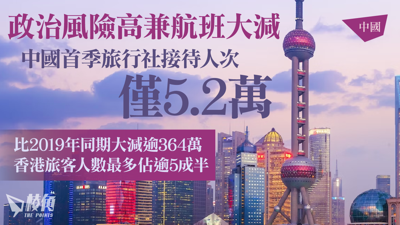 中國首季旅旅行社接待人次為52,009,當中香港人北上成為最大的客源,多達29,343人次,而澳門人則有11,300人次,至於其他外國旅客僅有11,366人次,據華爾街日報的資料,2019年同期中國旅行社的接待人次為370萬人之多,疫情前後的差距高逾364萬之多。