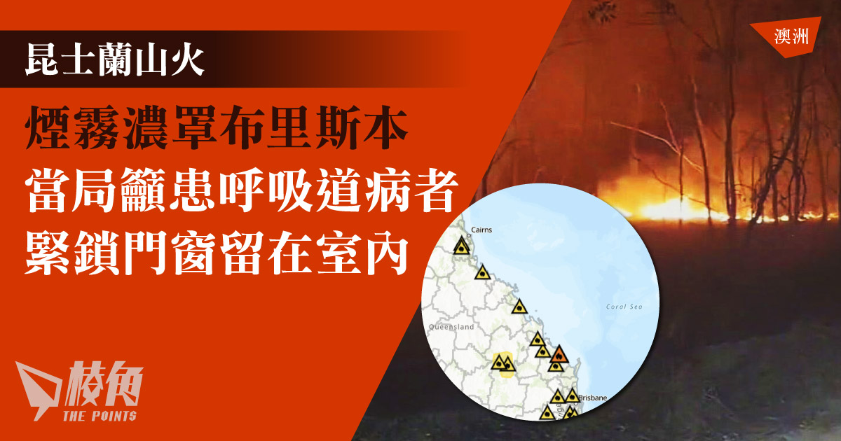 昆州東南角和西部地區發生的山火,煙霧濃罩大布里斯本地區,昆州消防和救援部門表示,濃煙可能會持續至少至周四上午,呼籲呼吸道疾病的人士要緊閉門窗,並盡量留在室內。