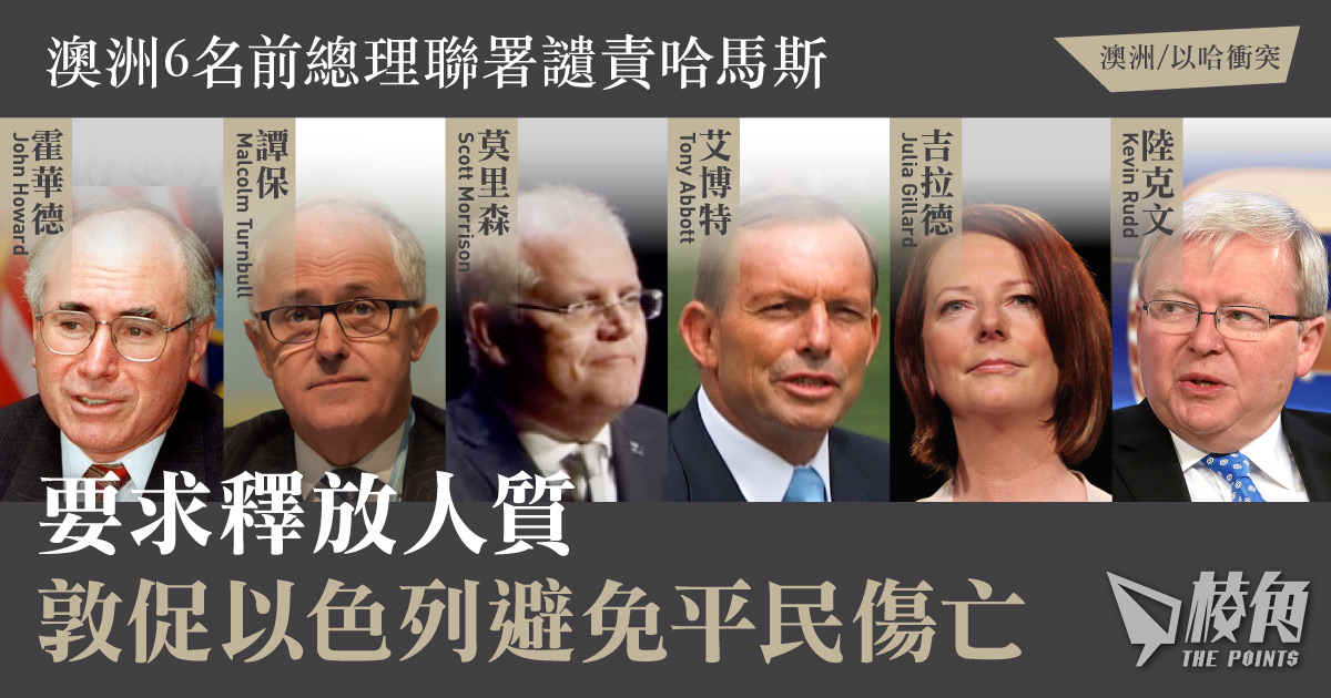 澳洲6名前總理罕有地發出聯署信,譴責哈馬斯,支持以色列,並呼籲與澳洲猶太人社區團結一致。信中要求哈馬斯立即釋放人質,以及敦促以色列要避免平民傷亡。澳洲當健在的前總理中,只有前總理基廷(Paul Keating)沒有聯名,他並發聲明表示不會聯署。