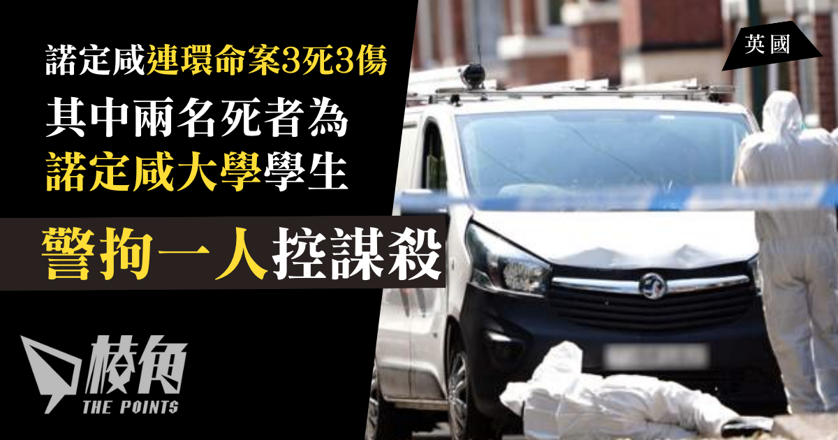 英國諾定咸(Nottingham)市中心周二(13日)凌晨發生3宗連環襲擊,兩人先被七人車司機刺死,繼而有人被七人車撞,共釀3死3傷。諾定咸大學證實其中兩名死者為該校學生。警方事後封鎖市中心6條街道,一名31歲七人車司機涉嫌謀殺被捕。