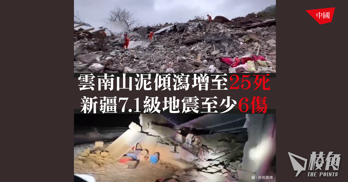 雲南省昭通市鎮雄縣山泥傾瀉事件,央視報道,截至今日下午4時,災害已造成25人遇難,其餘失蹤人員正在持續搜救。早前報道指事故中總共有44人被埋。當局周二(23日)凌晨召開新聞發布會,指崩塌的山泥多達7萬立方米,到現場指導救災的副總理張國清,強調要嚴密防範次生災害。