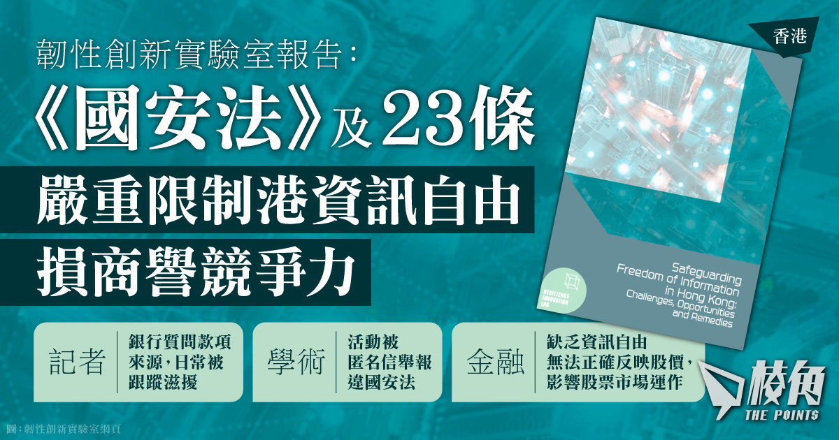 有研究機構就香港自《國安法》及《23條》實施後的⾹港資訊自由作分析報告,指出香港政府「依法」監控及限制資訊存取和傳播,令政府透明度大減、新聞⾃由受侵蝕、企業難以取得數據,除損害公民社會監督政府,長遠影響亦國際商譽,損害經濟競爭⼒,及增加交易風險。