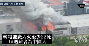 - 南韓京畿道華城市一座鋰電池工廠周一發生大火,已造成最少22死8傷,另有一人失蹤