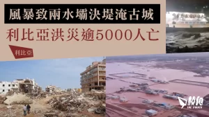 地中海風暴丹尼爾(Daniel)日前吹襲北非國家利比亞,為當地帶來暴雨引發洪災。其中,東北部沿海城市德爾納(Derna)附近的兩座水壩因風災缺堤,洪水湧入市內,至今造成超過5000人死亡、1萬多人失蹤。
